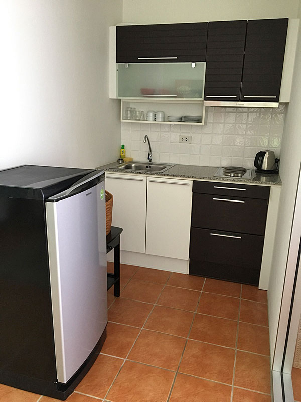 Liesitaso, liesituuletin, jääkaappi/pakastin, vedenkeitin, kahvinkeitin, leivänpaahdin ja astiasto ruoanlaittovälineineen.